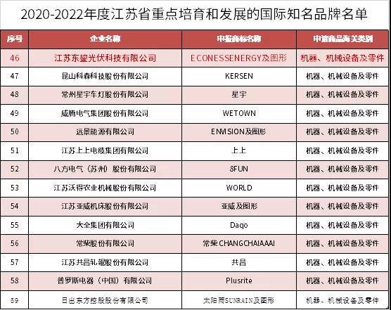 據(jù)了解,本次開(kāi)展2020—2022年度江蘇省重點(diǎn)培育和發(fā)展的國(guó)際知名品牌評(píng)審工作,旨在提升自主品牌國(guó)際競(jìng)爭(zhēng)力,深入實(shí)施對(duì)外貿(mào)易“優(yōu)進(jìn)優(yōu)出”戰(zhàn)略,加快推進(jìn)貿(mào)易高質(zhì)量發(fā)展。今年,全省共有413家企業(yè)的421個(gè)品牌入選,入選品牌數(shù)量比上屆增加61個(gè),入選企業(yè)綜合實(shí)力進(jìn)一步提高,高新技術(shù)企業(yè)占比超過(guò)3/4,參與制定國(guó)際、國(guó)家及行業(yè)標(biāo)準(zhǔn)近2500個(gè),擁有各類專利、著作權(quán)近3.5萬(wàn)個(gè)。東鋆光伏憑借自身良好的國(guó)際化品牌與口碑入選其中。