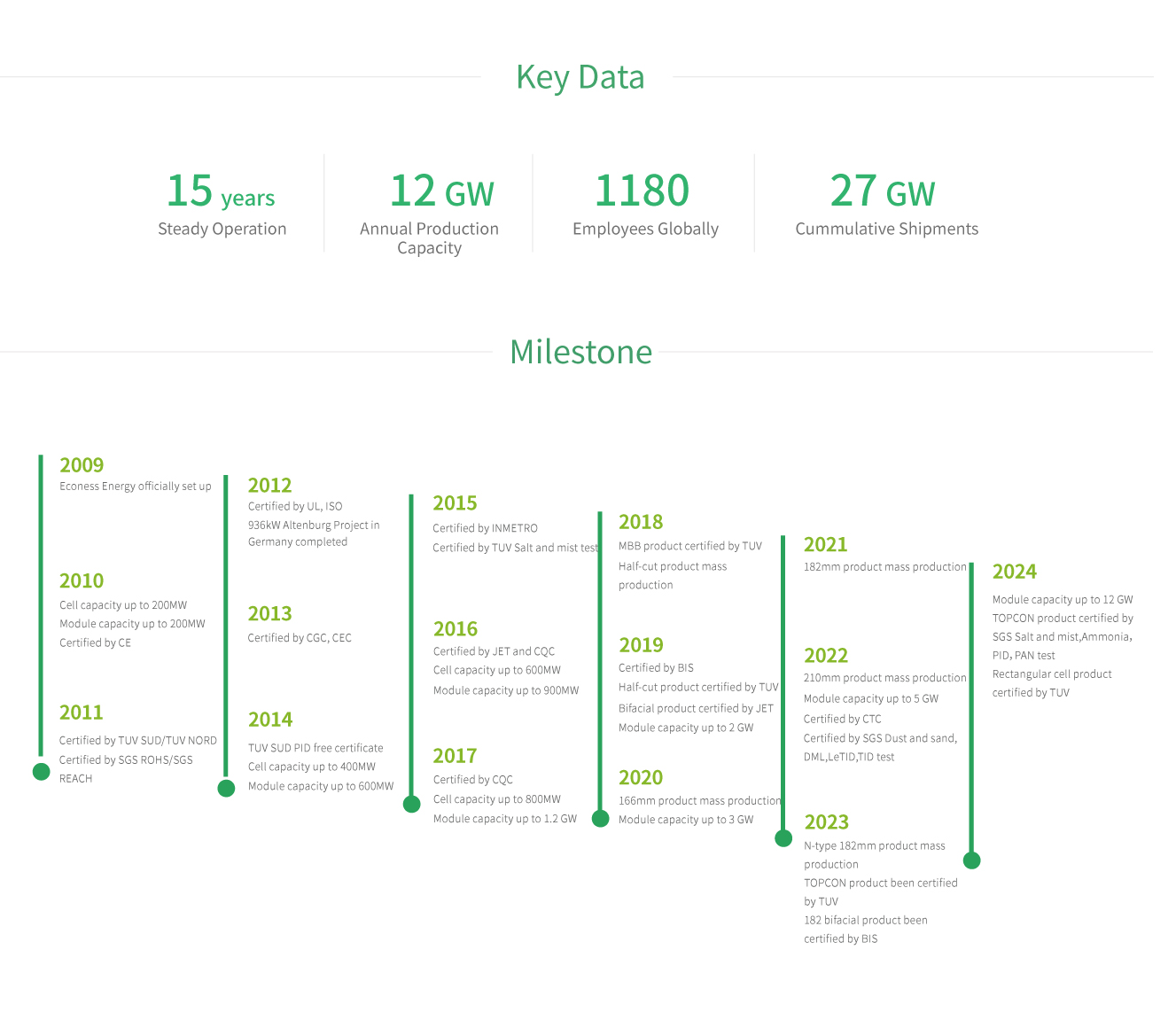 Established in 2009 , Econess Energy is engaged in PV power station development and PV module production. With current annual production capacity of 12GW modules, Econess Energy now distributes its PV products all over the world,such as Germany, Spain, Italy, France, India, Japan ect. As a strong, bankable partner, we are committed to building strategic, mutually beneficial collaboration with installers and developers.