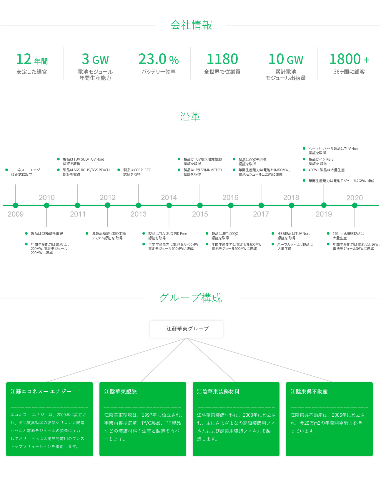 エコネスー·エナジー有限會社は、2009年江蘇華東グループによって設(shè)立され、太陽電池製品の専門メーカー及びソリューションを提供する専門メーカーです。弊社は現(xiàn)在、年間生産能力は電池セル 1 GW 、電池モジュール 3 GW に達(dá)しており。エコネスー.エナジーは大規(guī)模地面発電所、貧困支援プロジェクト、産業(yè)用·商業(yè)用太陽光発電所と家庭用太陽光発電所などを含み、世界 36 カ國と地域の顧客をカバーしています。エコネスー·エナジーは、信頼性の高い革新的な製品と高品質(zhì)サービスをすべての顧客に提供し、優(yōu)れた財(cái)務(wù)狀況とブランド融資能力でパートナーに強(qiáng)力なサポートを提供します。
